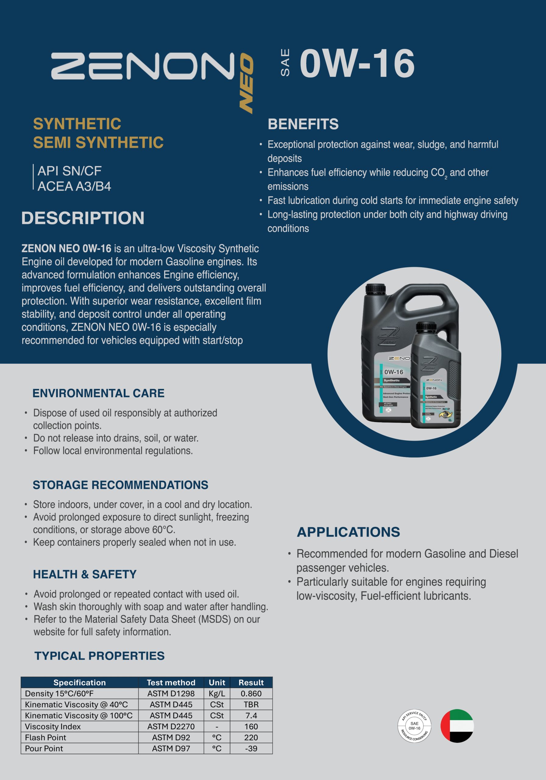 ZENON NEO 0W-16 is an ultra-low Viscosity Synthetic Engine oil developed for modern Gasoline engines. Its advanced formulation enhances Engine efficiency, improves fuel efficiency, and delivers outstanding overall protection. With superior wear resistance, excellent film stability, and deposit control under all operating conditions, ZENON NEO 0W-16 is especially recommended for vehicles equipped with start/stop systems.