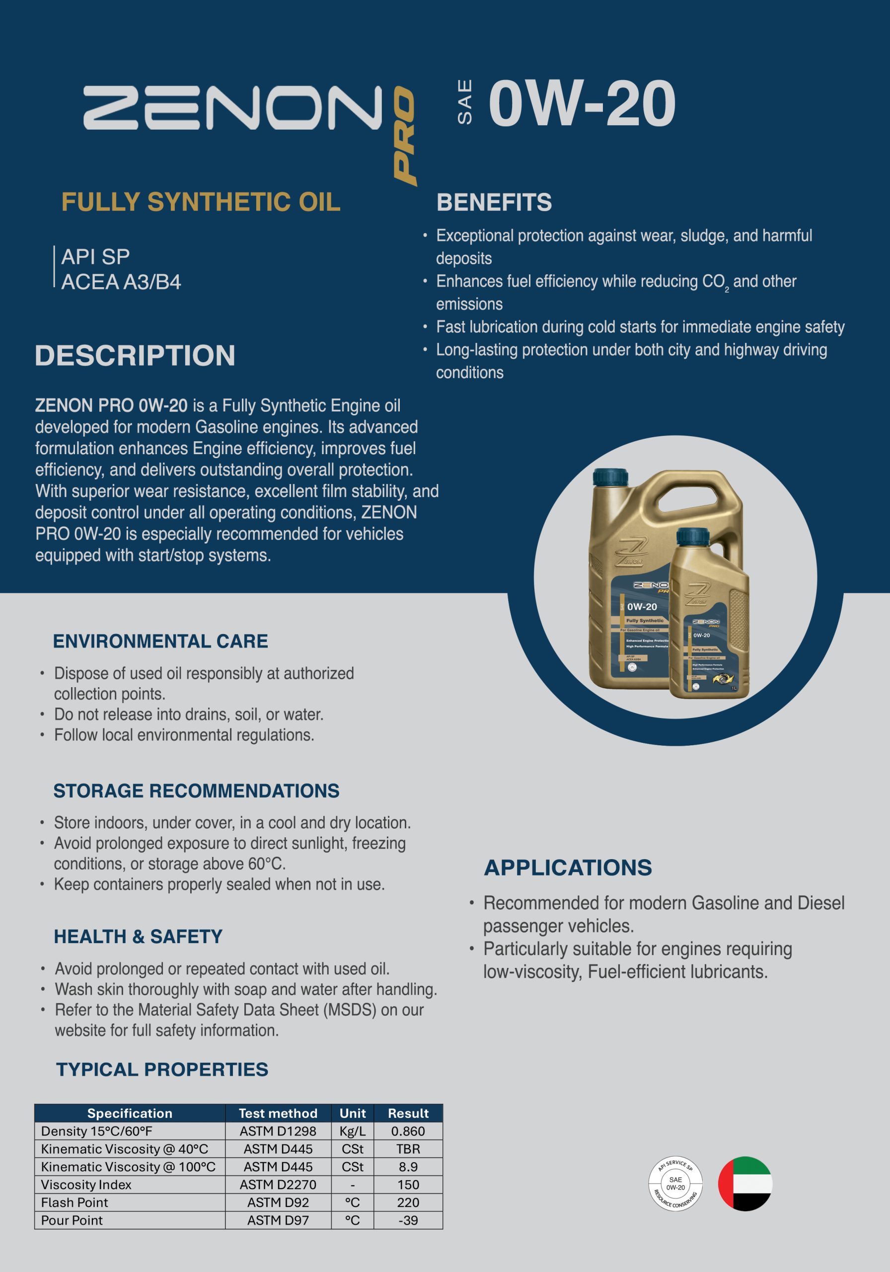 ZENON PRO 0W-20 is a fully Synthetic Engine oil developed for modern Gasoline engines. Its advanced formulation enhances Engine efficiency, improves fuel efficiency, and delivers outstanding overall protection. With superior wear resistance, excellent film stability, and deposit control under all operating conditions, ZENON PRO 0W-20 is especially recommended for vehicles equipped with start/stop systems.