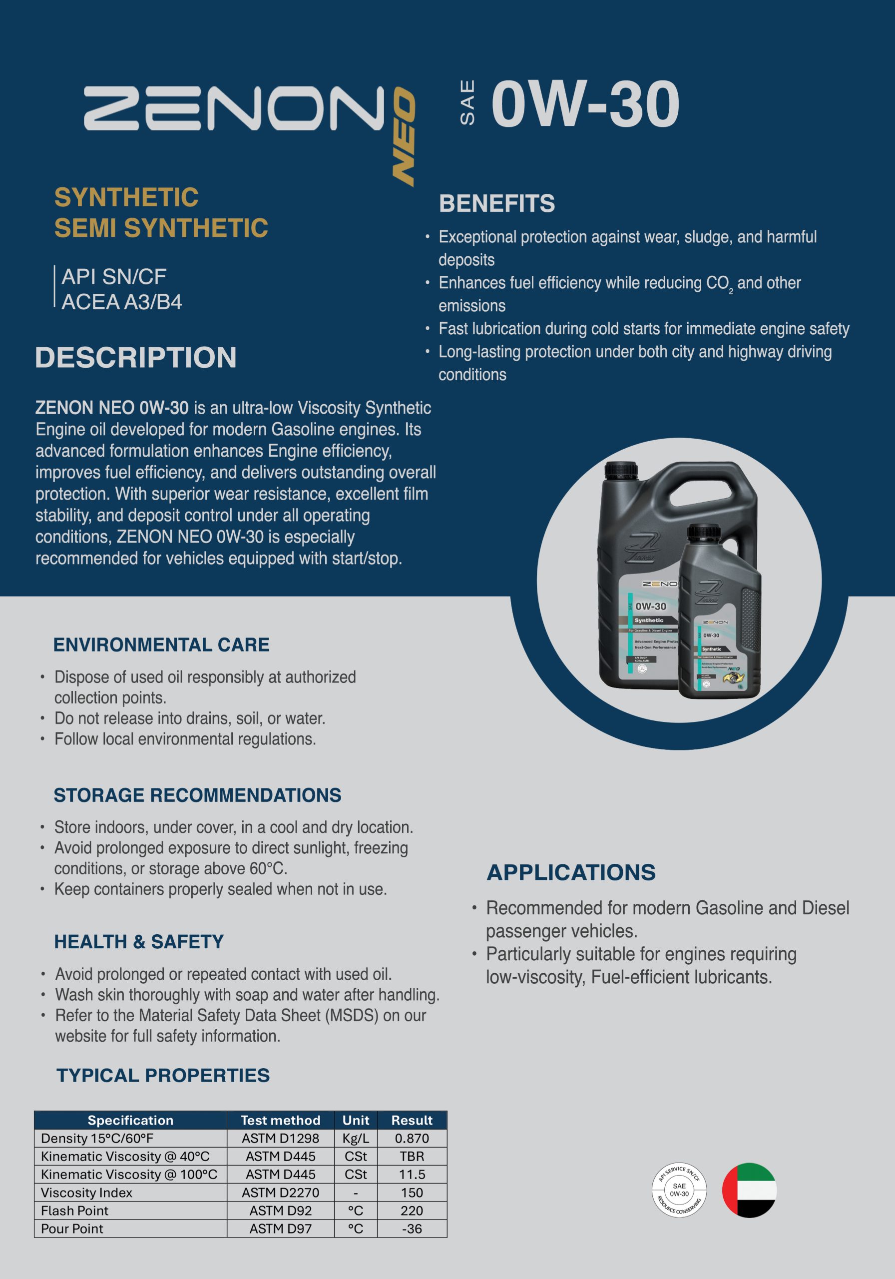 ZENON NEO 0W-30 is an ultra-low Viscosity Synthetic Engine oil developed for modern Gasoline engines. Its advanced formulation enhances Engine efficiency, improves fuel efficiency, and delivers outstanding overall protection. With superior wear resistance, excellent film stability, and deposit control under all operating conditions, ZENON NEO 0W-30 is especially recommended for vehicles equipped with start/stop systems.