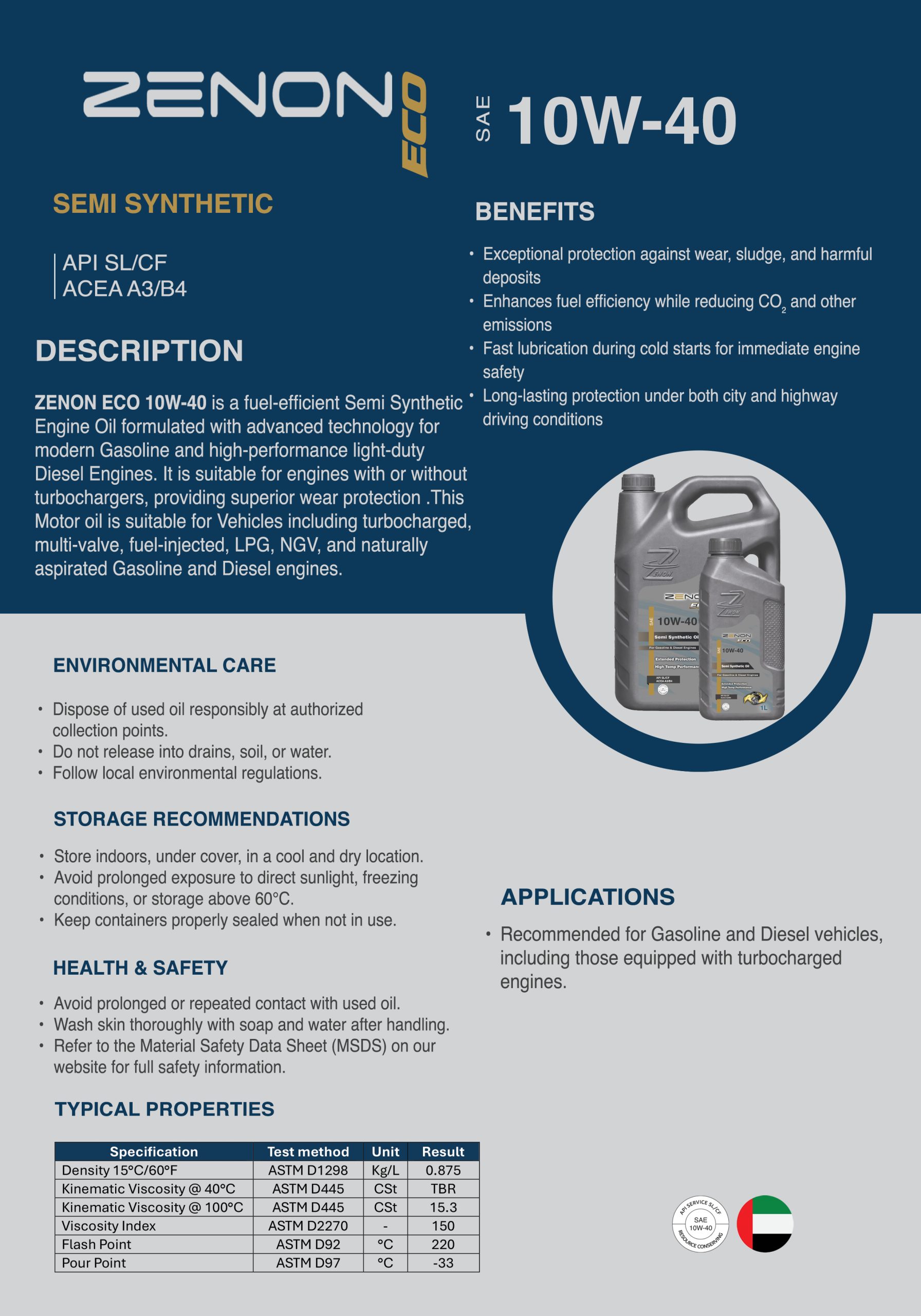 ZENON ECO 10w-40 is a fuel-efficient Semi Synthetic Engine Oil formulated with advanced technology for modern Gasoline and high-performance light-duty Diesel Engines. It is suitable for engines with or without turbochargers, providing superior wear protection .This Motor oil is suitable for Vehicles including turbocharged, multi-valve, fuel-injected, LPG, NGV, and naturally aspirated Gasoline and Diesel engines.