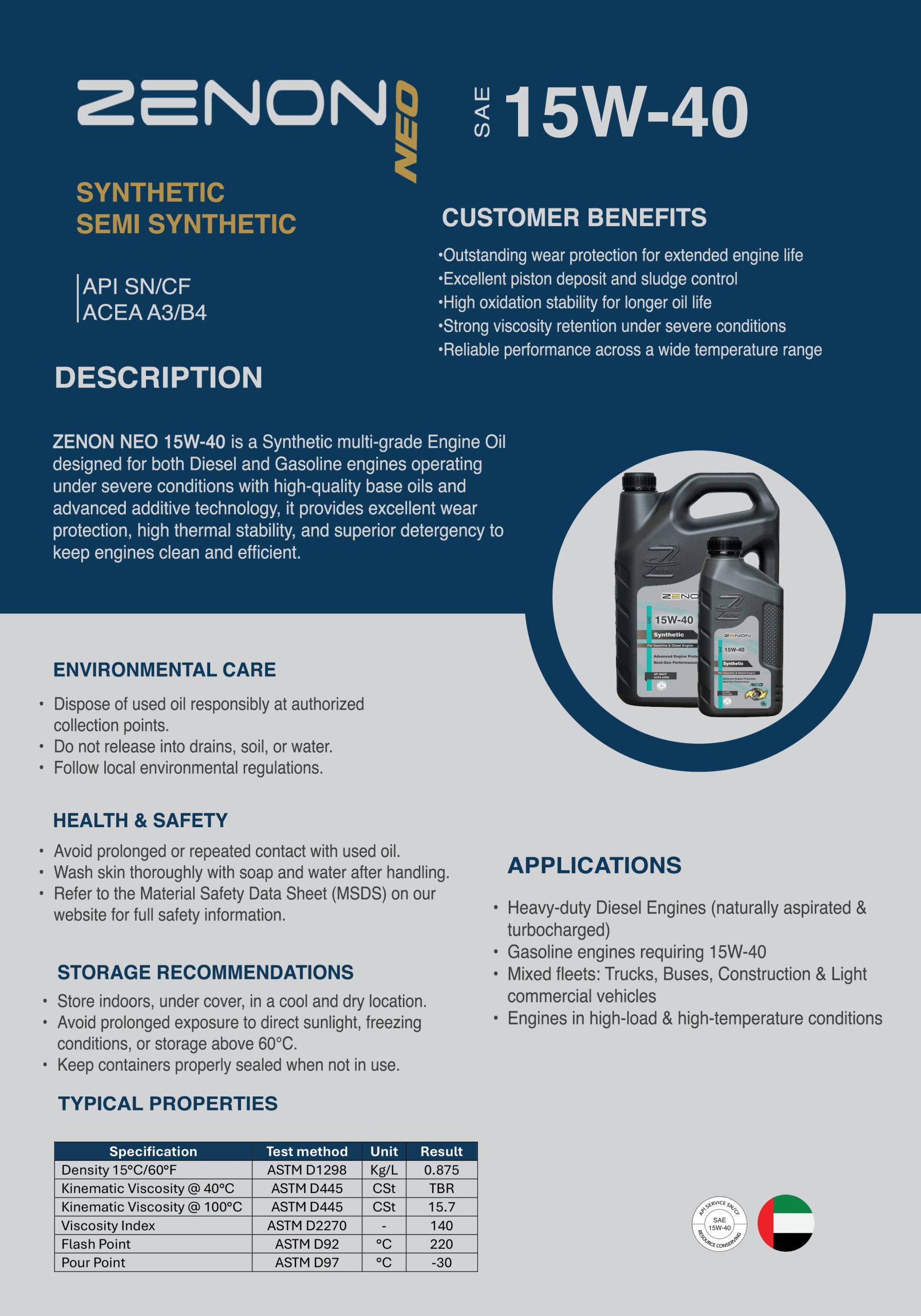 ZENON NEO 15W-40 is a Synthetic multi-grade Engine Oil designed for both Diesel and Gasoline engines operating under severe conditions with high-quality base oils and advanced additive technology, it provides excellent wear protection, high thermal stability, and superior detergency to keep engines clean and efficient.
