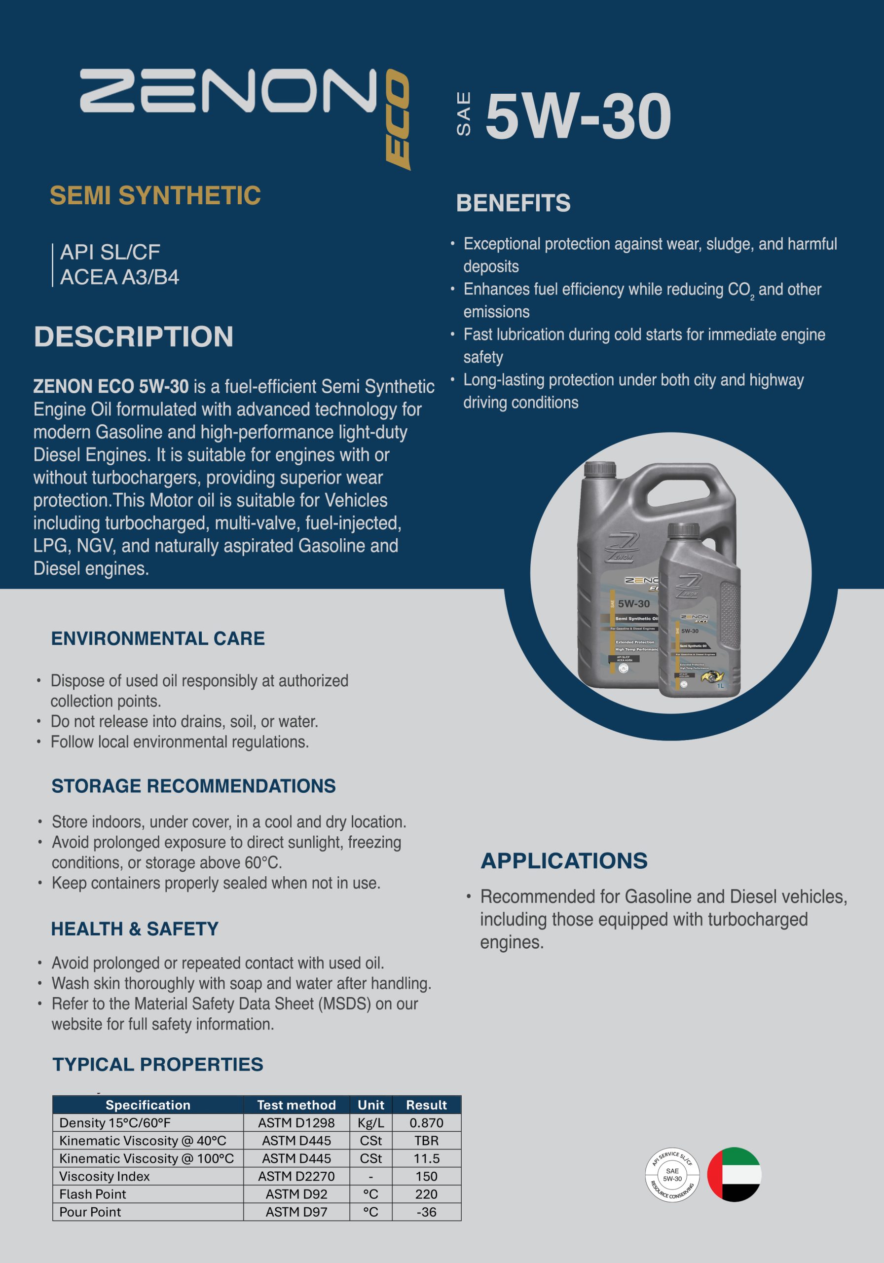 ZENON ECO 5W-30 is a fuel-efficient Semi Synthetic Engine Oil formulated with advanced technology for modern Gasoline and high-performance light-duty Diesel Engines. It is suitable for engines with or without turbochargers, providing superior wear protection.This Motor oil is suitable for Vehicles including turbocharged, multi-valve, fuel-injected, LPG, NGV, and naturally aspirated Gasoline and Diesel engines.