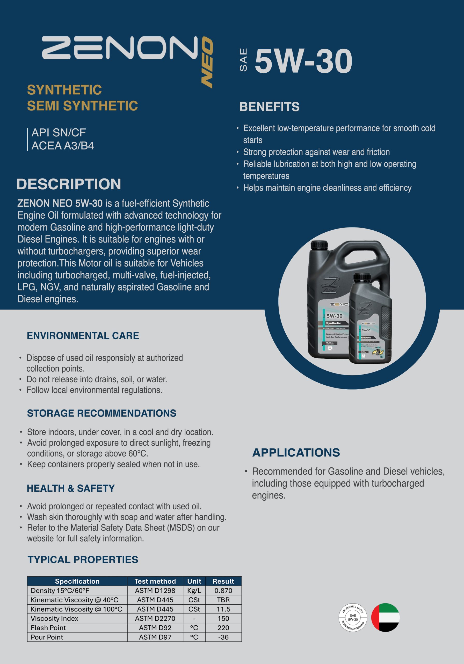 ZENON NEO 5W-30 is a fuel-efficient Synthetic Engine Oil formulated with advanced technology for modern Gasoline and high-performance light-duty Diesel Engines. It is suitable for engines with or without turbochargers, providing superior wear protection.This Motor oil is suitable for Vehicles including turbocharged, multi-valve, fuel-injected, LPG, NGV, and naturally aspirated Gasoline and Diesel engines.