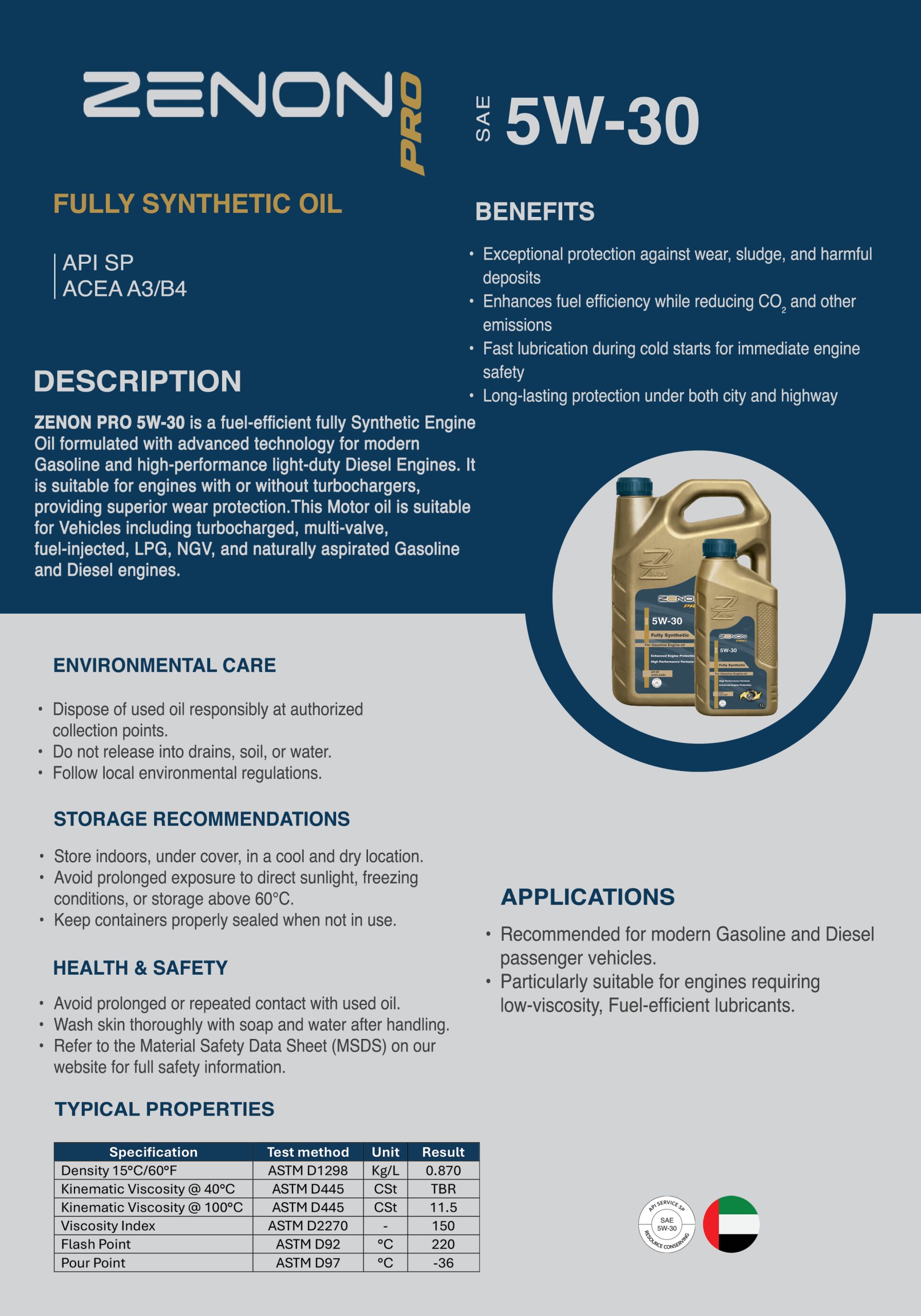 ZENON PRO 5W-30 is a fuel-efficient fully Synthetic Engine Oil formulated with advanced technology for modern Gasoline and high-performance light-duty Diesel Engines. It is suitable for engines with or without turbochargers, providing superior wear protection.This Motor oil is suitable for Vehicles including turbocharged, multi-valve, fuel-injected, LPG, NGV, and naturally aspirated Gasoline and Diesel engines.