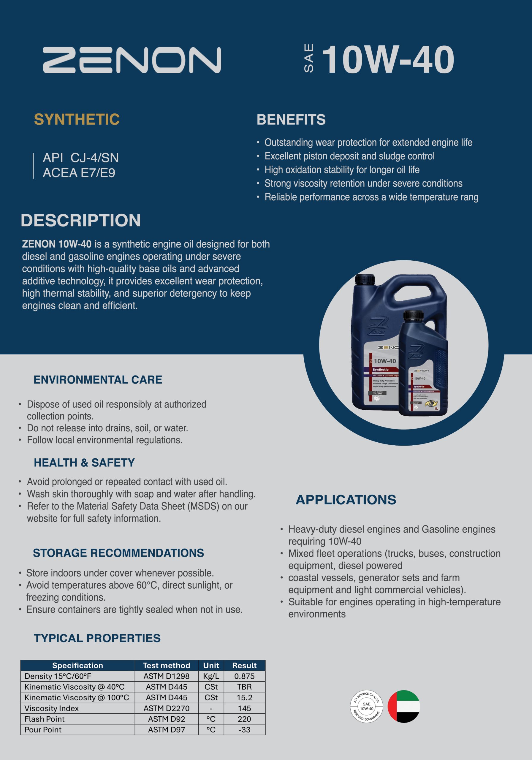 ZENON 10W-40 is a synthetic engine oil designed for both diesel and gasoline engines operating under severe conditions with high-quality base oils and advanced additive technology, it provides excellent wear protection, high thermal stability, and superior detergency to keep engines clean and efficient.