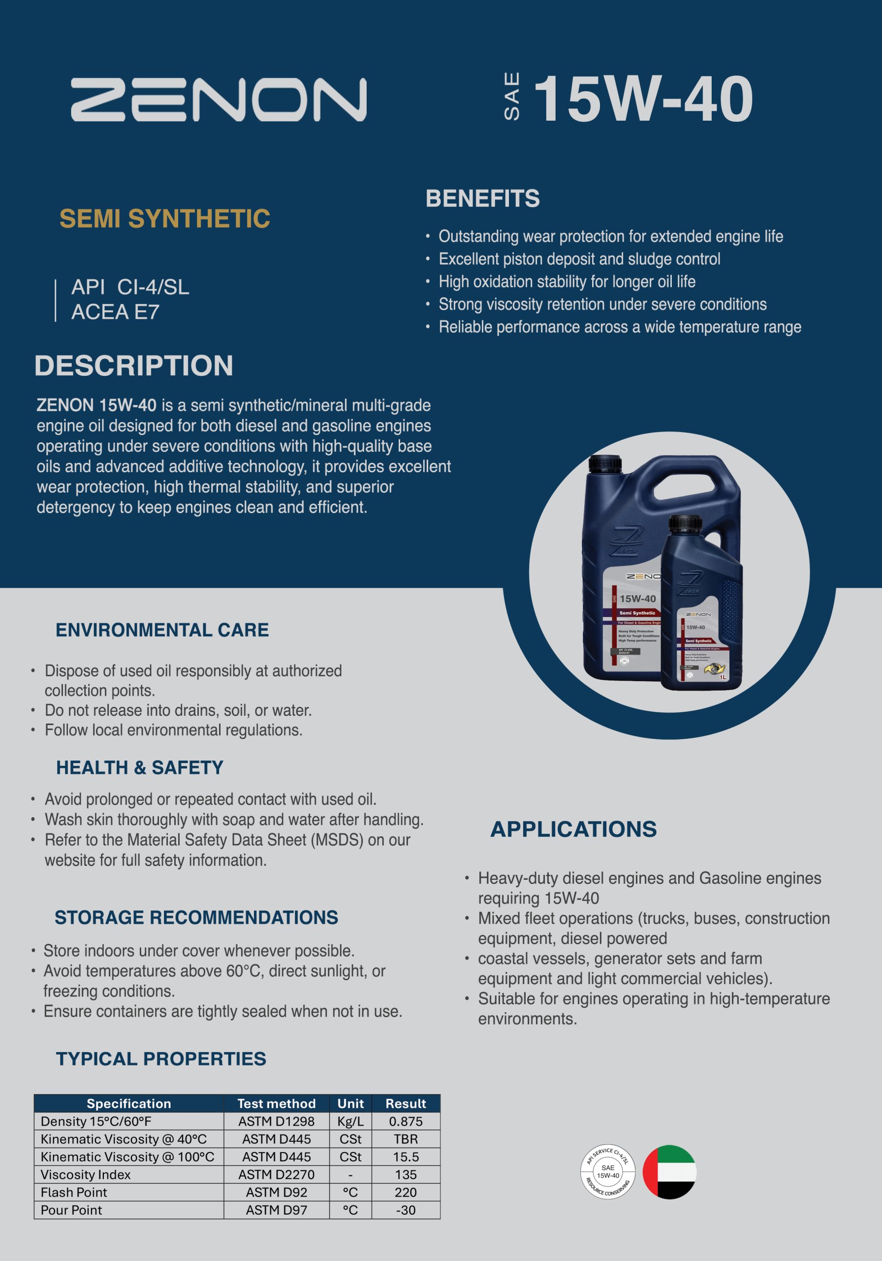 ZENON 15W-40 is a semi synthetic/mineral multi-grade engine oil designed for both diesel and gasoline engines operating under severe conditions with high-quality base oils and advanced additive technology, it provides excellent wear protection, high thermal stability, and superior detergency to keep engines clean and efficient.