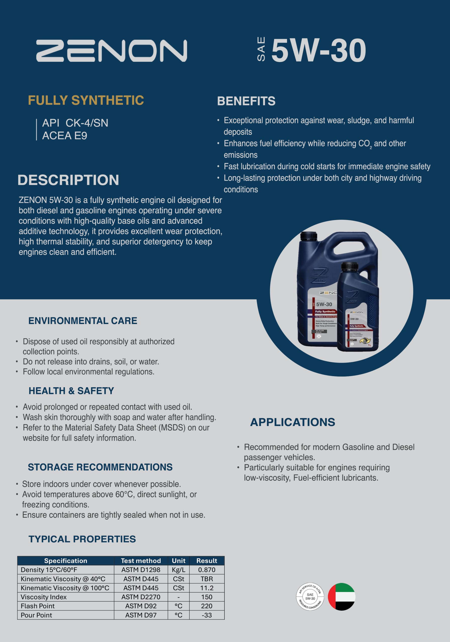 ZENON 5W-30 is a fully synthetic engine oil designed for both diesel and gasoline engines operating under severe conditions with high-quality base oils and advanced additive technology, it provides excellent wear protection, high thermal stability, and superior detergency to keep engines clean and efficient.